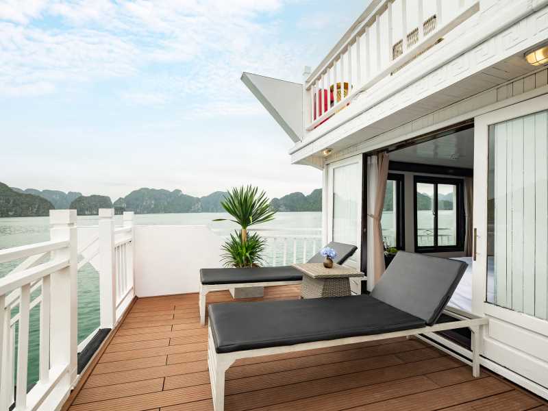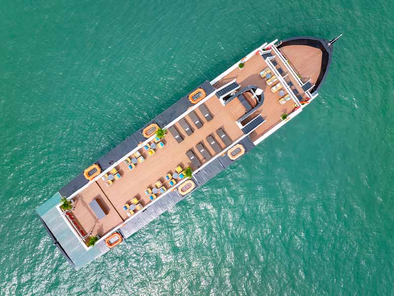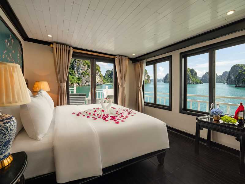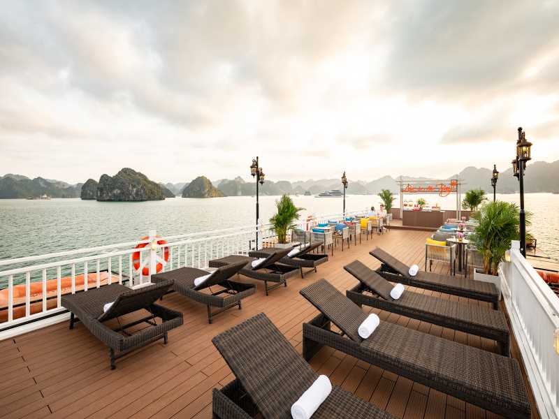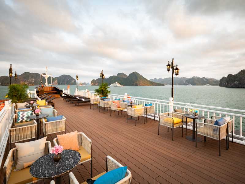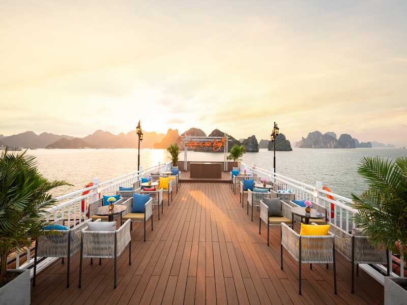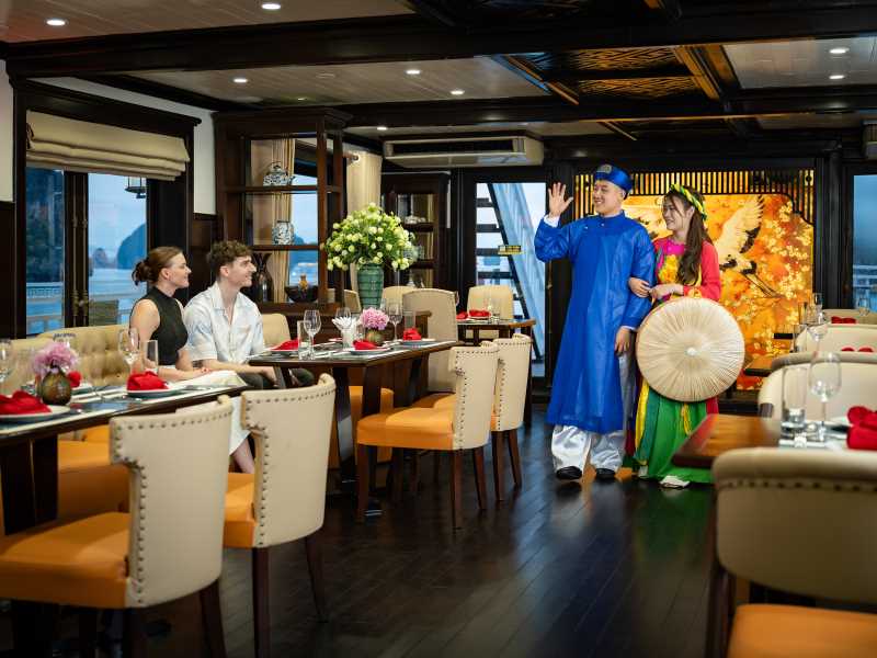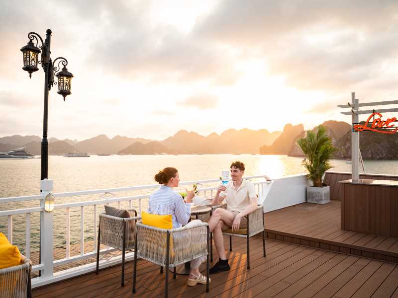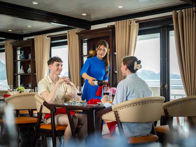 Enjoy a romantic dinner served at the restaurant while admiring the sparkling beauty of Ha Long Bay at night.